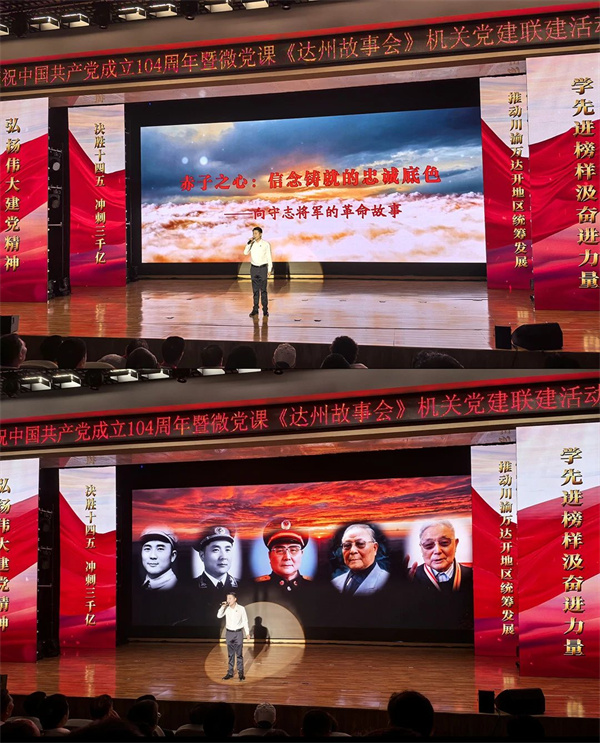 6月27日上午,由中共四川省委省直机关工委、中共重庆市委直属机关工委指导,中共达州市委市直机关工委、达州市融媒体中心主办,中共重庆市开州区委直属机关工委、中共绵阳市委市直机关工委、四川人民出版社协办的“微党课《达州故事会》·今天我来讲”2025年第二季在达州市举行。川渝两地机关党员干部及预备党员代表共500人参加。向守志将军之子向孝民作为特邀嘉宾出席。