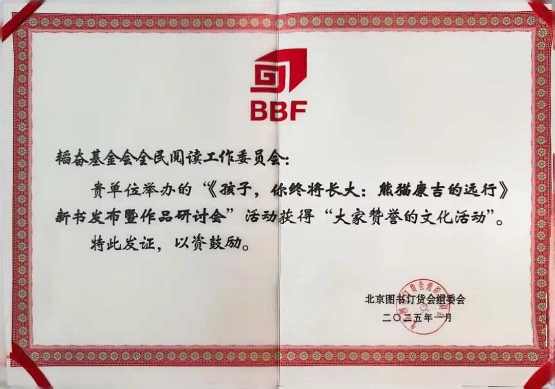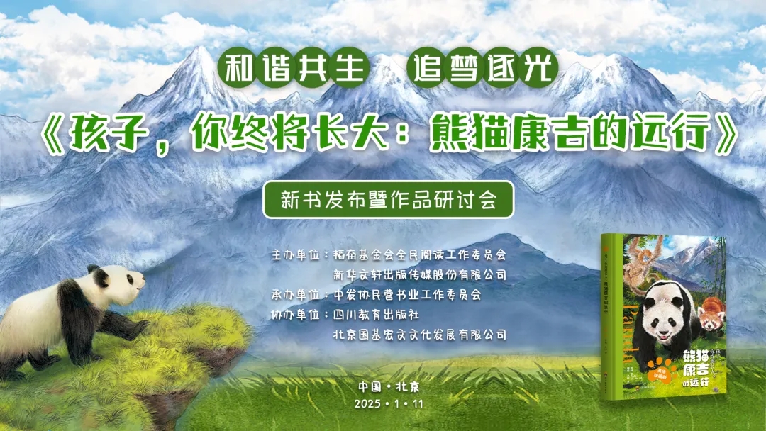 2025年1月11日,《孩子,你终将长大:熊猫康吉的远行》新书发布暨作品研讨会在北京新华书店总店城市书房举办。活动由韬奋基金会全民阅读工作委员会、新华文轩出版传媒股份有限公司主办,中国书刊发行业协会民营书业工作委员会承办,四川教育出版社、北京国基宏文文化发展有限公司协办。