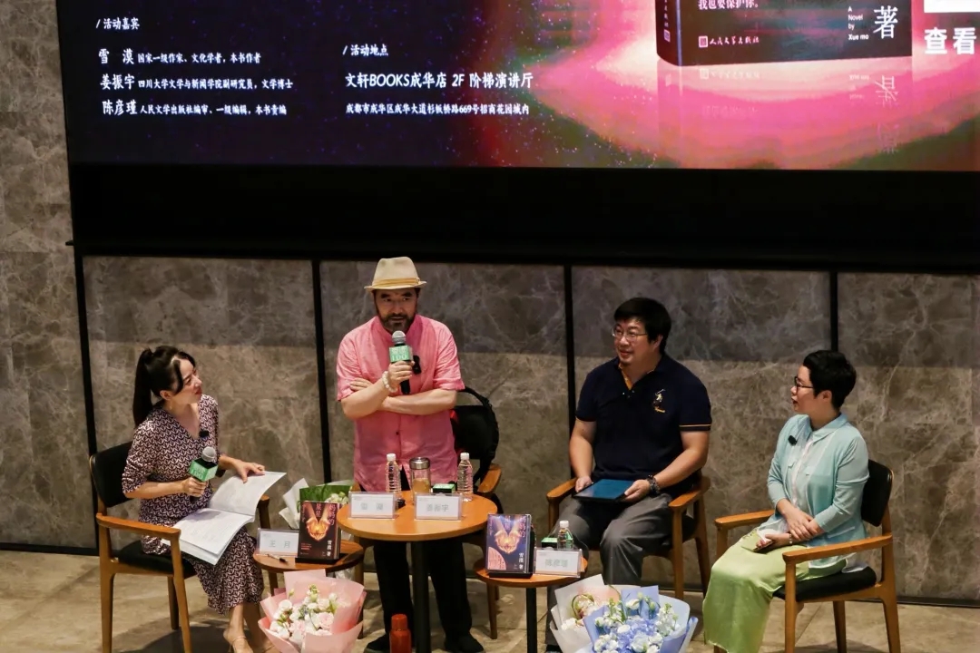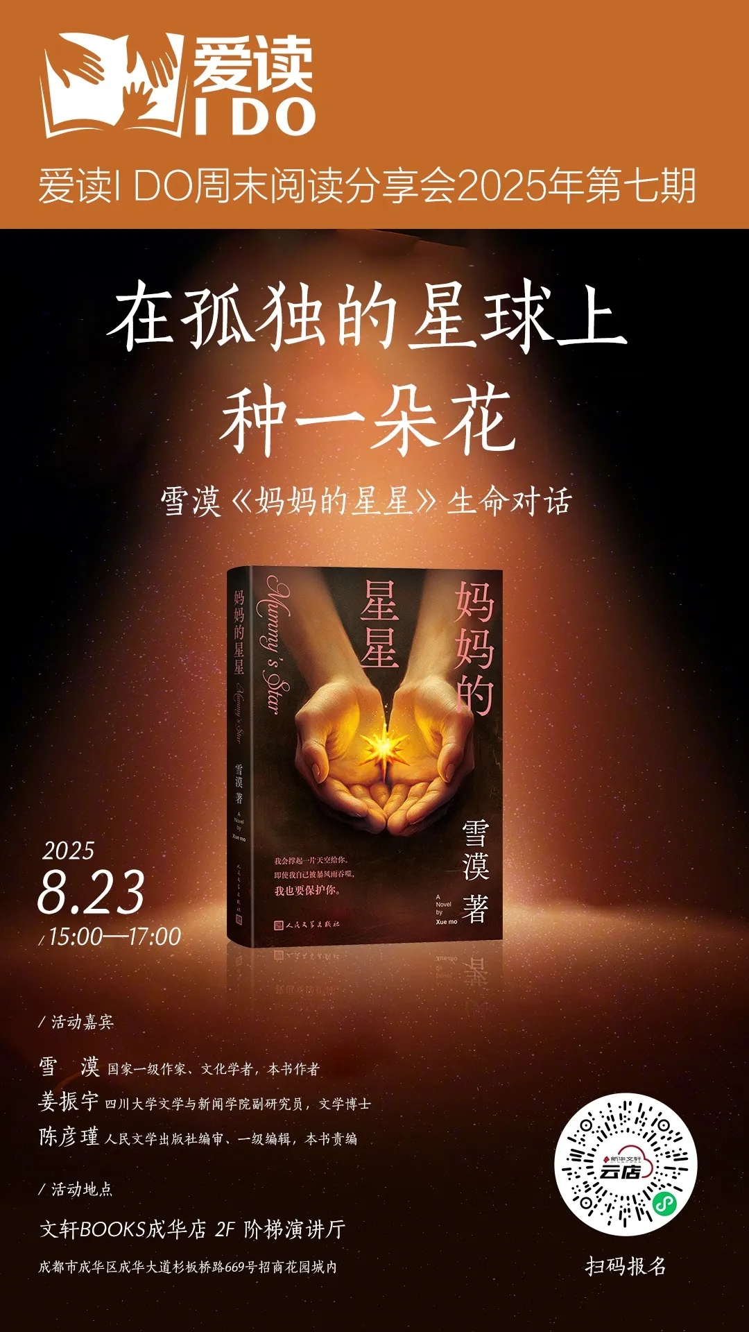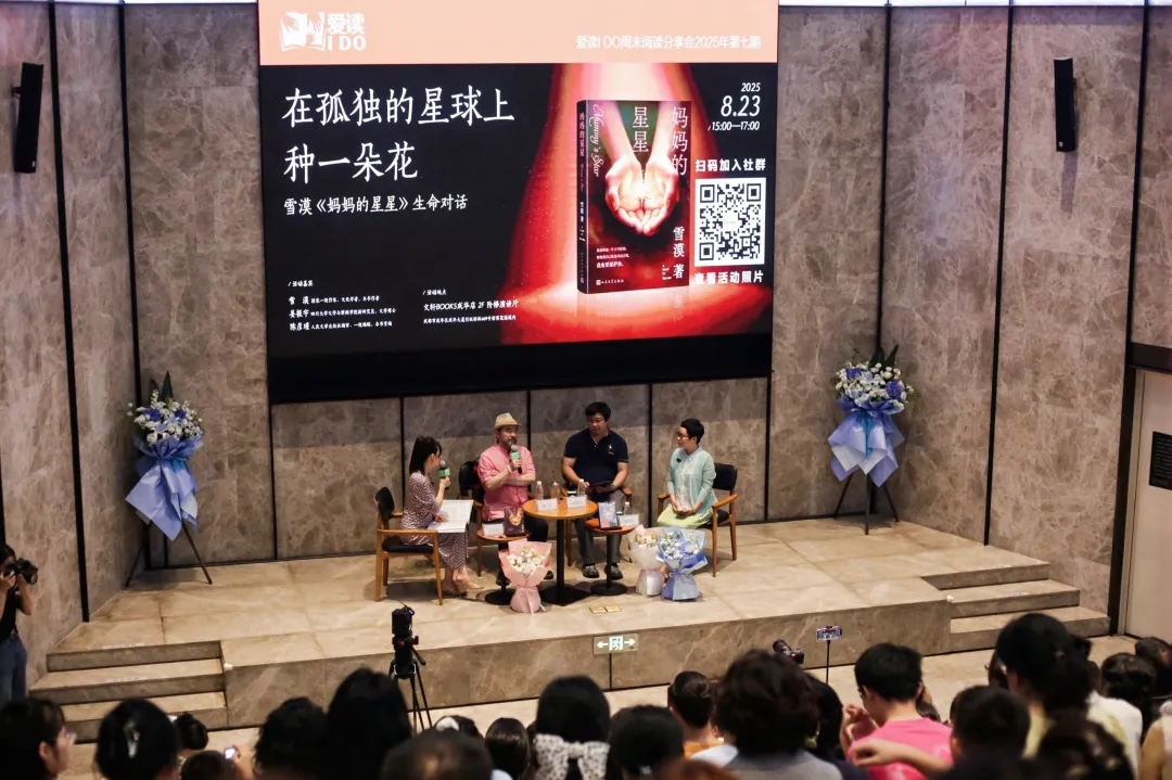 8月23日下午3点,“爱读IDO周末阅读分享会”第七期——在孤独的星球上种一朵花——雪漠《妈妈的星星》生命对话新书分享会在文轩BOOKS成华店举行。国家一级作家、甘肃省作协副主席、本书作者雪漠,四川大学文学与新闻学院副研究员,文学博士姜振宇,人民文学出版社编审、一级编辑,本书责编陈彦瑾,围绕《妈妈的星星》从文学、教育等不同角度展开跨界对话,为读者带来一场关于爱、理解与希望的思想交流。